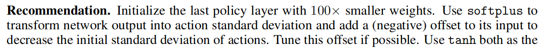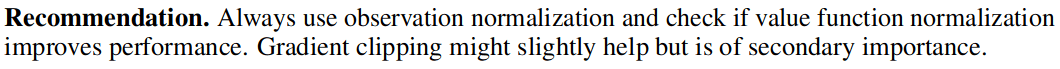 - Normalization and clipping (gradient clip, obs norm, ...)